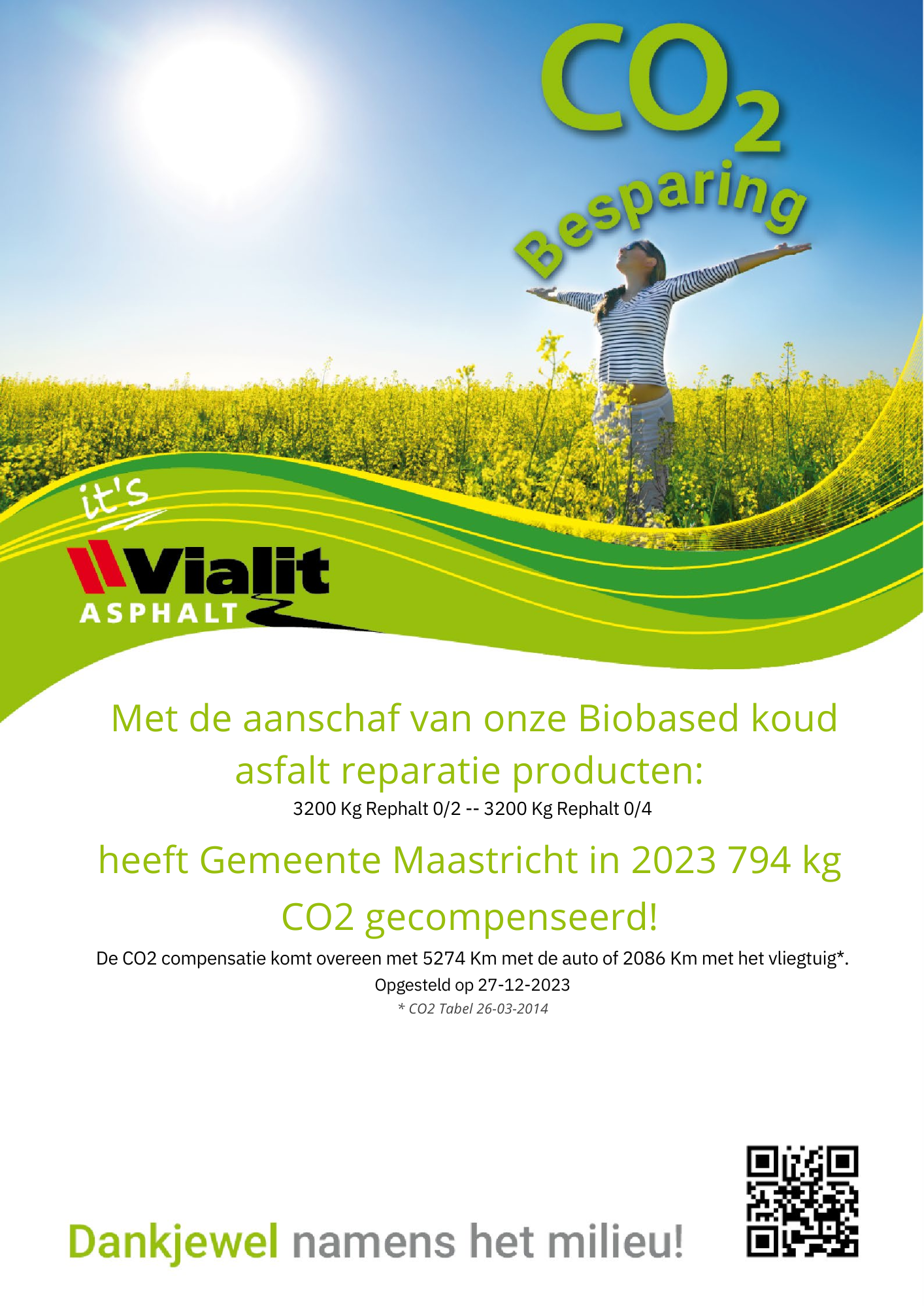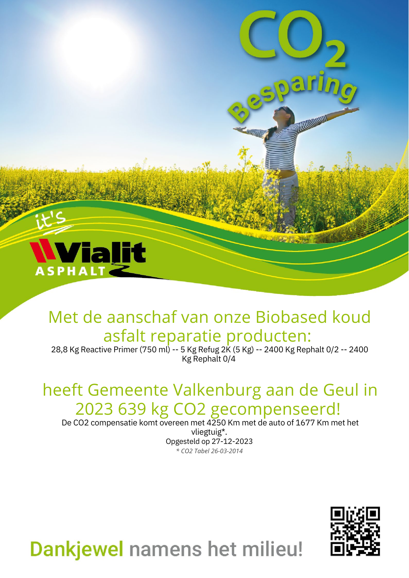 Met het verwerken van 14.608 kg Biobased Rephalt heeft Asfaltbouw BV 1.519 kg CO2 gecompenseerd!