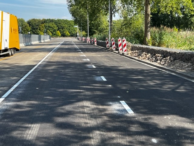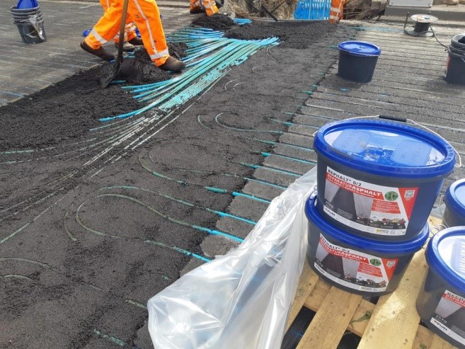 Aan beide uiteinden van de rijbaan lagen grotere open stukken, omdat daar de buizen een draai maken. Maar de grootste uitdaging was het grote open vak waar de buizen samen komen en aan de zijkant naar beneden lopen. Deze vakken zijn opgevuld met onze Biobased Rephalt. Er is gekozen voor gradatie 0/2, omdat deze door zijn fijne korrel erg makkelijk tussen en onder de buizen kon worden aangebracht zodat alles goed opgevuld kon worden. Daar waar de buizen naar beneden lopen kon door deze buizen geen bekisting worden gemaakt. Maar de vakmensen van Dura Vermeer hebben dit kundig opgelost en de Rephalt 0/2 zo aangebracht dat deze de ruimte goed heeft opgevuld en niet naar beneden is gezakt. Vervolgens is er nog een slemlaag van Refug aangebracht af gestrooid met de 3mm split. Dit om voor een goede hechting van de nog aan te brengen deklaag zorgen.