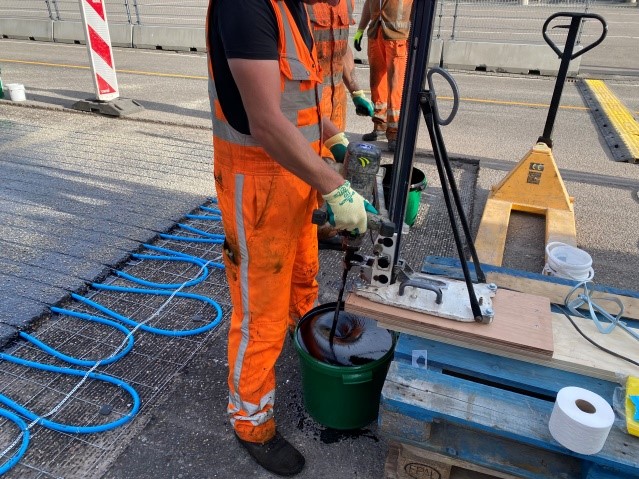 In het kader van duurzaamheid heeft het welbekende Ahoy Rotterdam besloten om warmte op te vangen op een groot stuk asfalt van de rijbaan naar P1 en deze warmte via buizen gemaakt van PE-kunststof te vervoeren naar de technische ruimte in het complex. Hiervoor is een groot stuk asfalt uit de rijbaan verwijderd en opnieuw aangelegd. Dura Vermeer is verantwoordelijk voor dit ambitieuze project. Dura Vermeer is begonnen met het leggen van de onderlaag en de tussenlaag. Voordat de deklaag erop gezet kon worden, moesten er eerst sleuven worden gefreesd om de buizen in te leggen. Meteen een deklaag van warm asfalt was natuurlijk geen optie. Dit zou desastreuze gevolgen hebben voor de kunststof buizen. Dit vroeg om een oplossing die koud aangebracht kon worden en toch de juiste eigenschappen heeft om een constructief onderdeel van de opbouw te zijn.