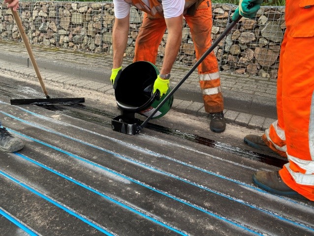 Dura Vermeer is hiervoor uitgekomen bij Vialit Benelux. Om de sleuven waarin de buizen liggen die warmte opvangen en transporteren te vullen is gekozen voor onze Biobased Refug koude voegvulmassa. Om de Refug genoeg body mee te geven zodat deze het aanbrengen van de deklaag met warm asfalt en een wals goed kon weerstaan is het aangebrachte materiaal direct in gestrooid met 3 mm split. Dit gaf de split de gelegenheid om tijdens het uitharden van de Refug in het materiaal te zakken en zo de Refug nog robuuster te maken.